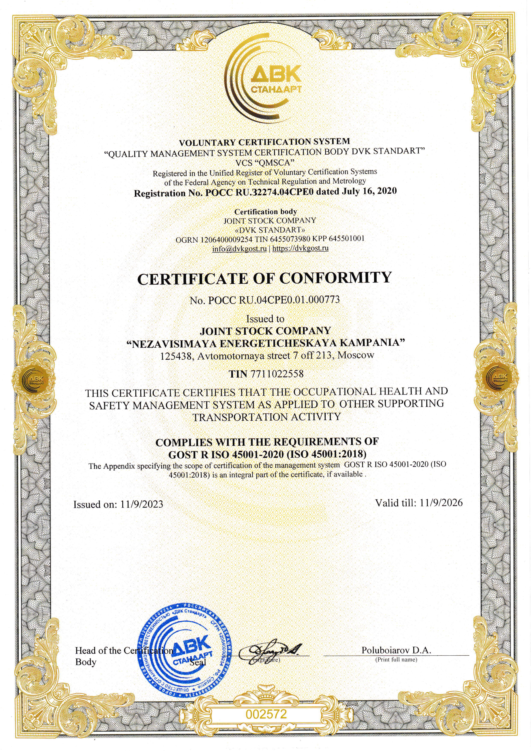 Certificate ISO 45001:2018 Occupational safety and health management system09.11.2023