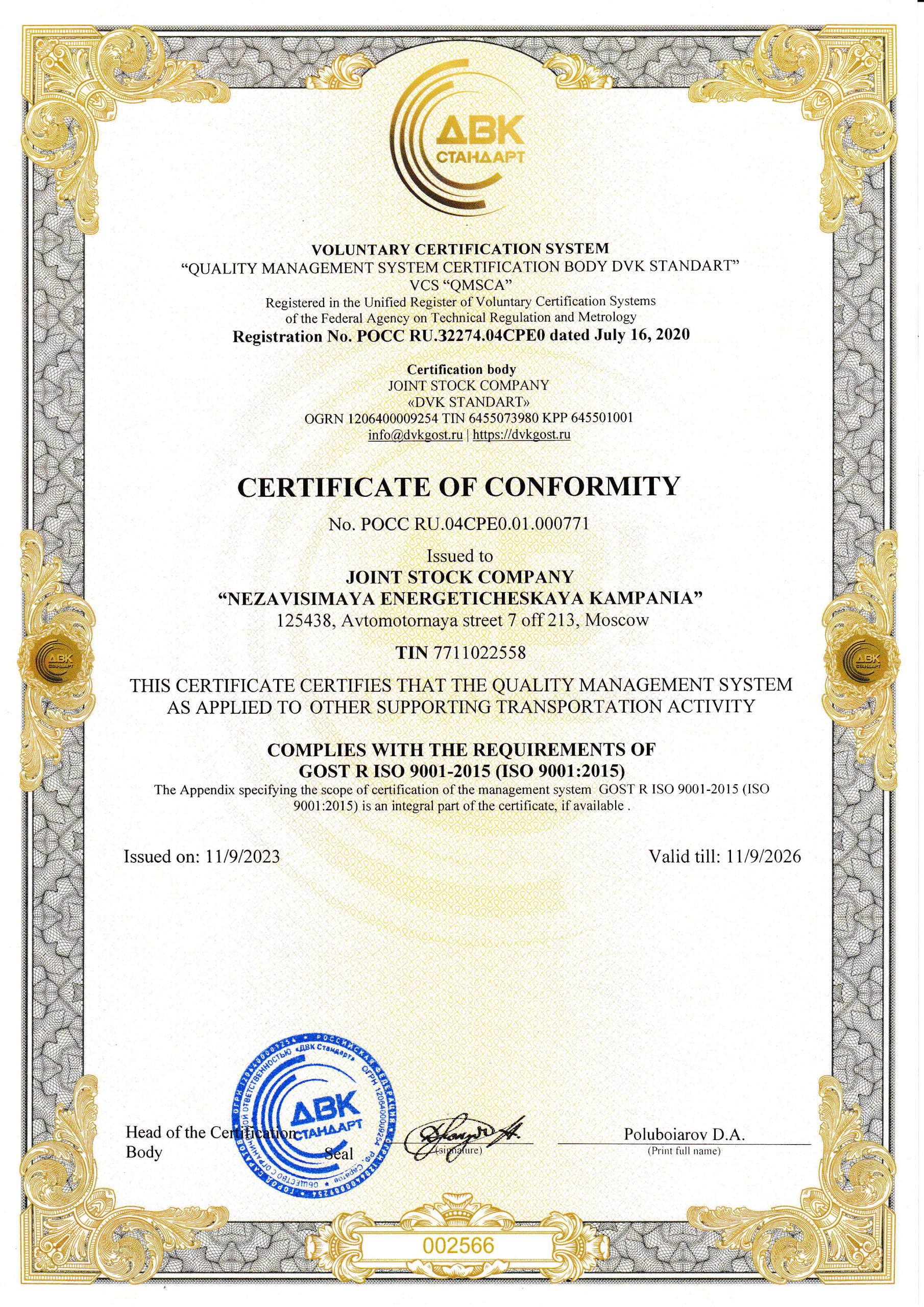 Certificate ISO 9001:2015 Quality management system09.11.2023