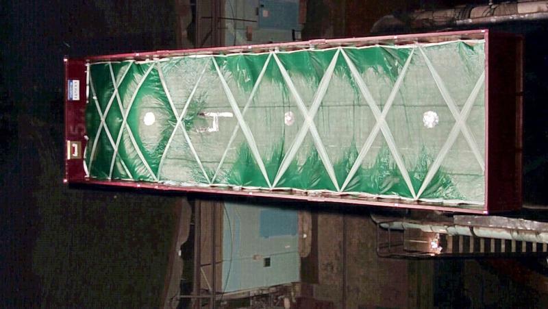 Fig.2.Sulfur fire in an open rail car under the cover – the fire was focused at the rupture of joint connecting cover canvas. The rail car is shown after the flame in the fire area has been extinguished.