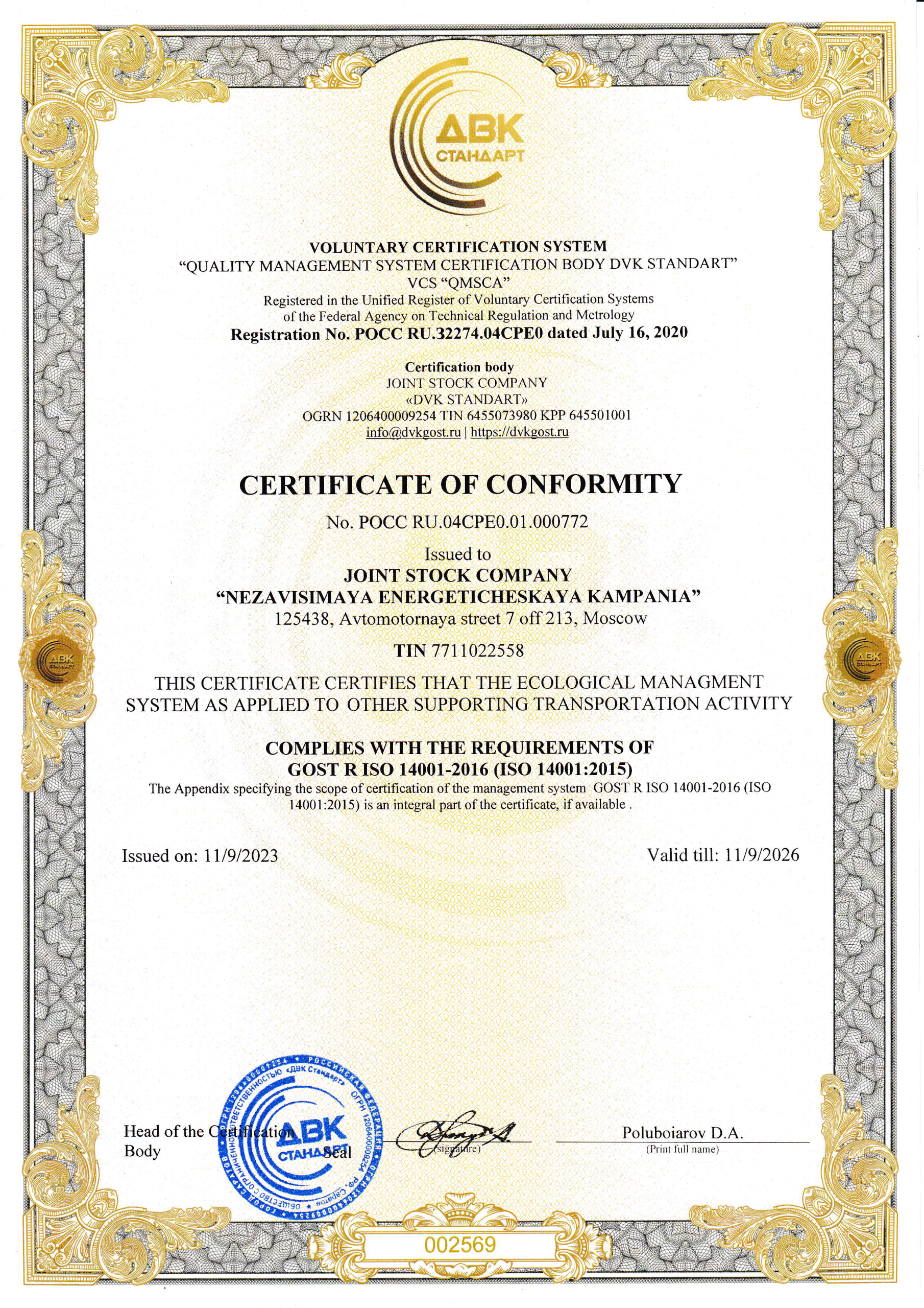 Certificate ISO 14001:2015 Ecological management system09.11.2023
