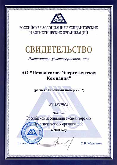 Certificate of membership in The Russian Association of Freight Forwarding and Logistic Organizations 2020